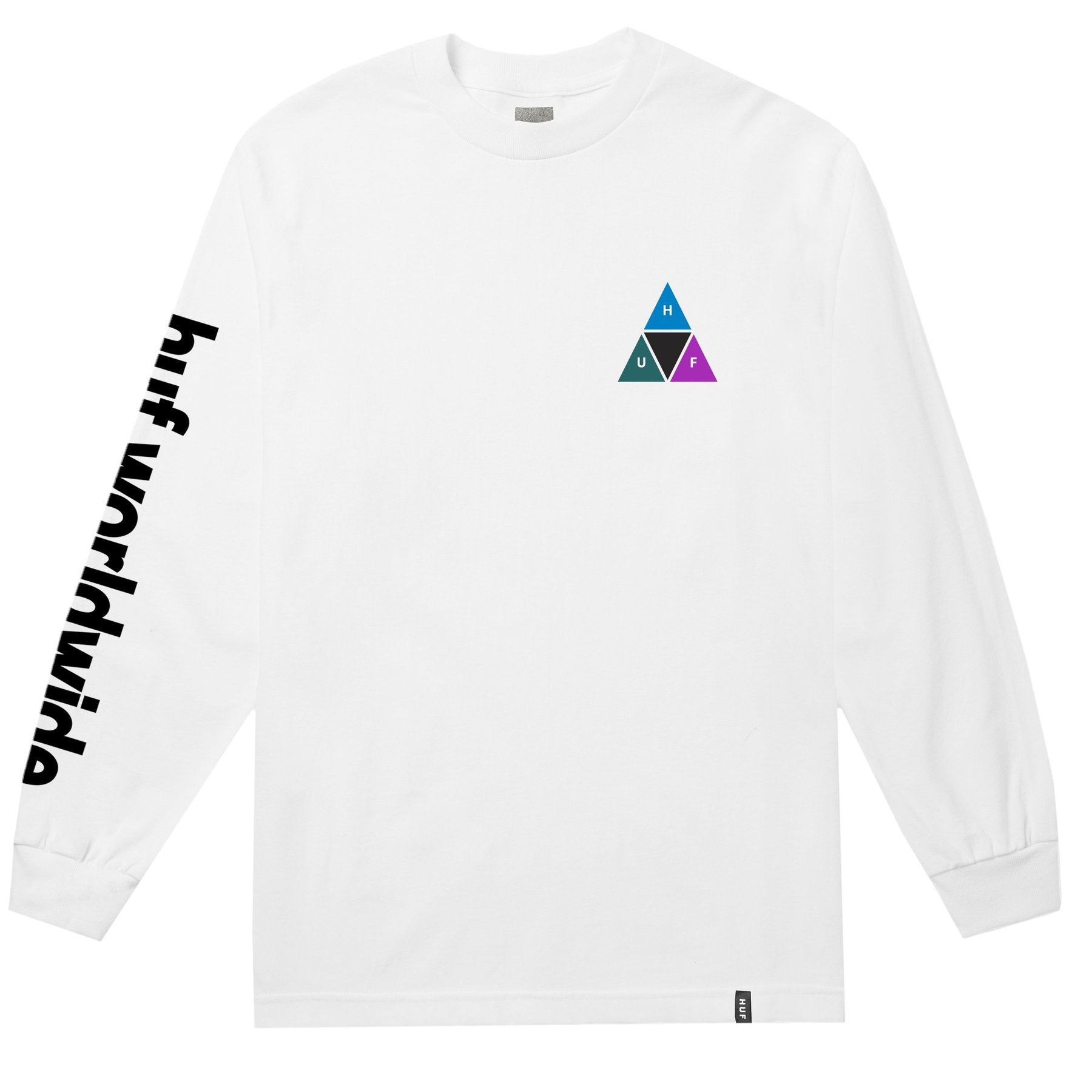 Made from pure cotton, the Prism Triple Triangle Long Sleeve Tee features HUF’s iconic Triple Triangle logo in a multicolour fill at the left chest and back, while oversized HUF Worldwide branding is printed down the right sleeve.