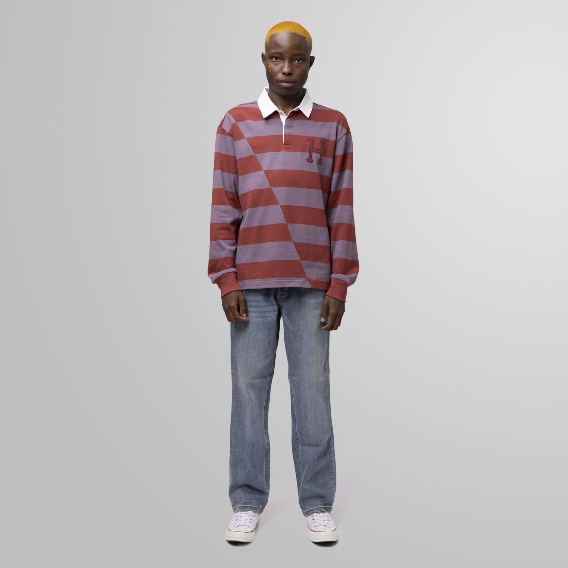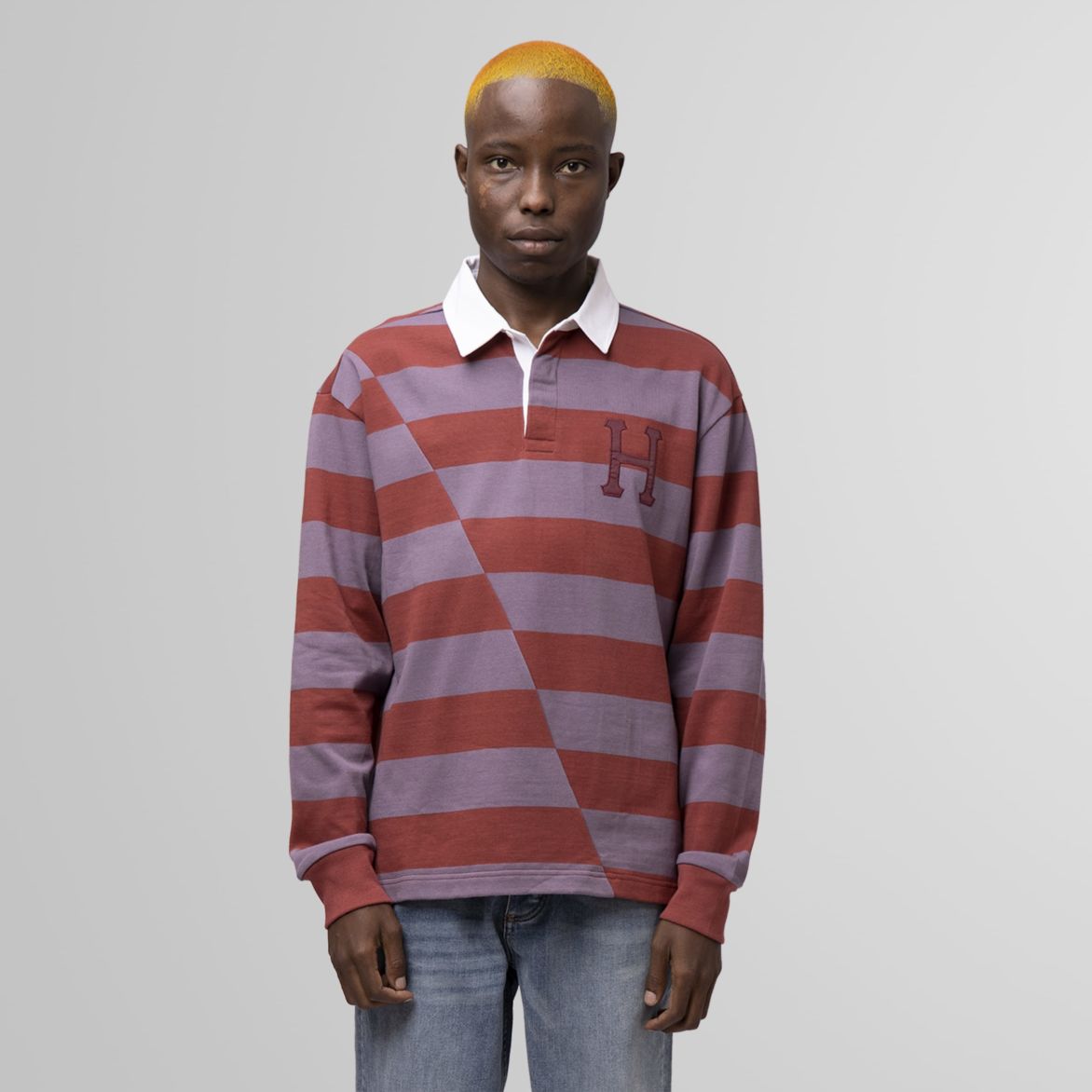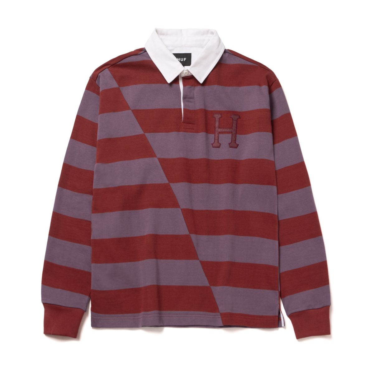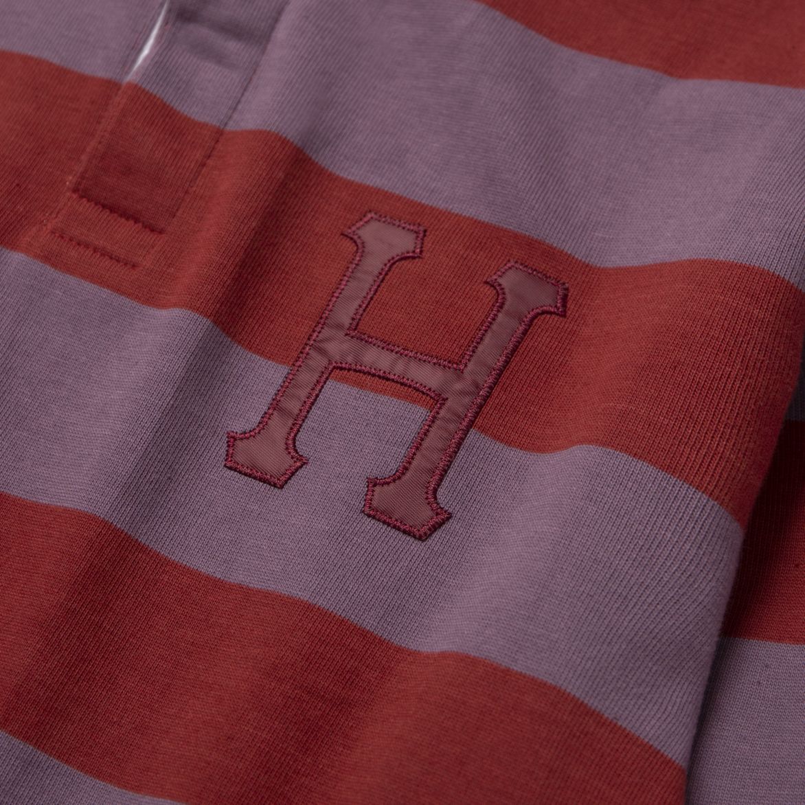 The Yorke Long Sleeve Rugby features offset horizontal striping, a contrast collar with button placket, and a ‘Classic H’ logo appliqué at left chest.