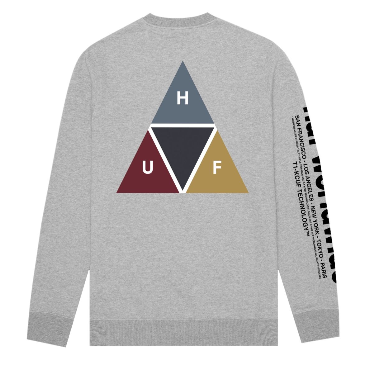 The Prism Crew is cut from super-soft, heritage sportswear-inspired fabric, and features a primary color-fill Triple Triangle logo at the left chest and back, and HUF Worldwide print down the right sleeve.