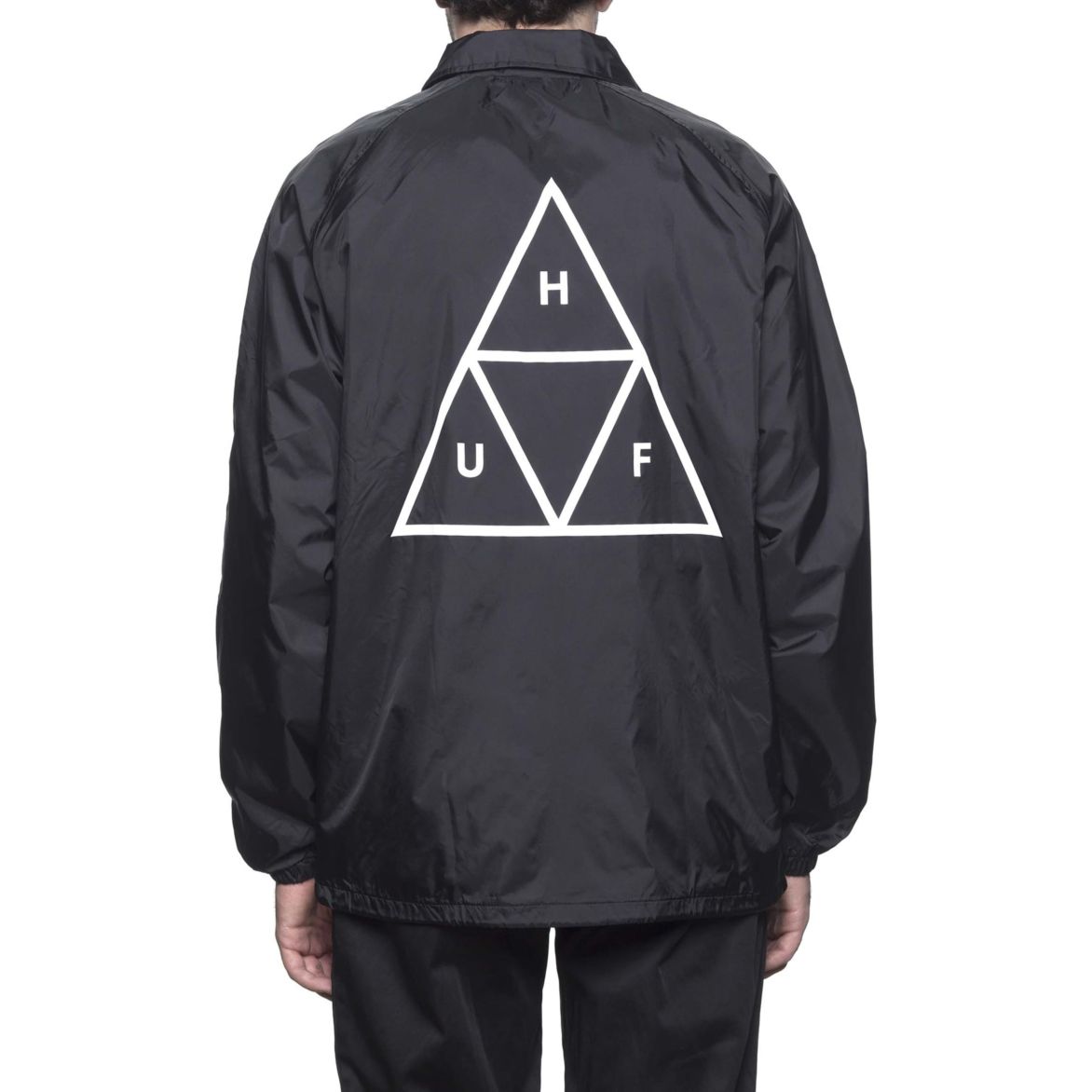 The Triple Triangle Coaches jacket features the HUF Triple Triangle logo screenprinted at front and back. Functional details include a button front closure, double hand pockets, and drawcord waist.