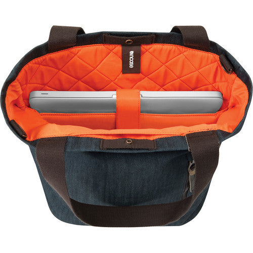 The charcoal chambray Terra Tote from Incase Designs has the outward appearance of your average shoulder bag that you might carry to the library or market. However, the reality is that it's a strong and fun way to carry around your 13" MacBook and iPhone. The Tote is made from a cotton chambray with a nylon taffeta lining. As stated, the appearance